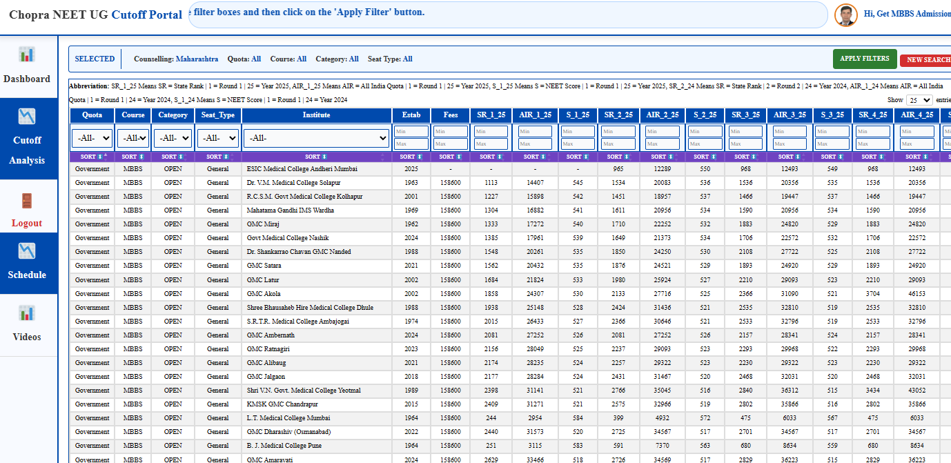 Maharashtra Govt medical colleges MBBS Admission 2025 cut off is as follows: UR-514 EWS-512 OBC-510 NT D -508 NT C-504 NT B-445 SC-419 ST-321.