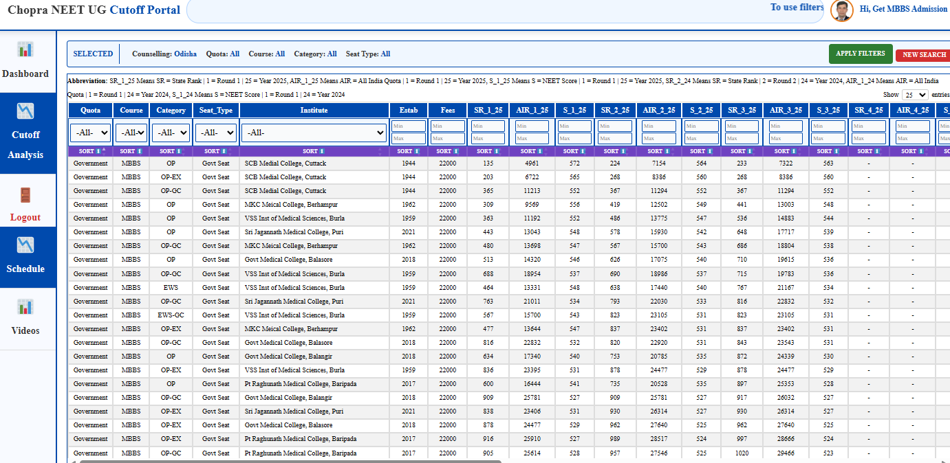 | Gov-Schl | SC | Govt Med Coll, Balangir | 105193(1) | 105193(1) | 114392(1) | 93042(1) |
