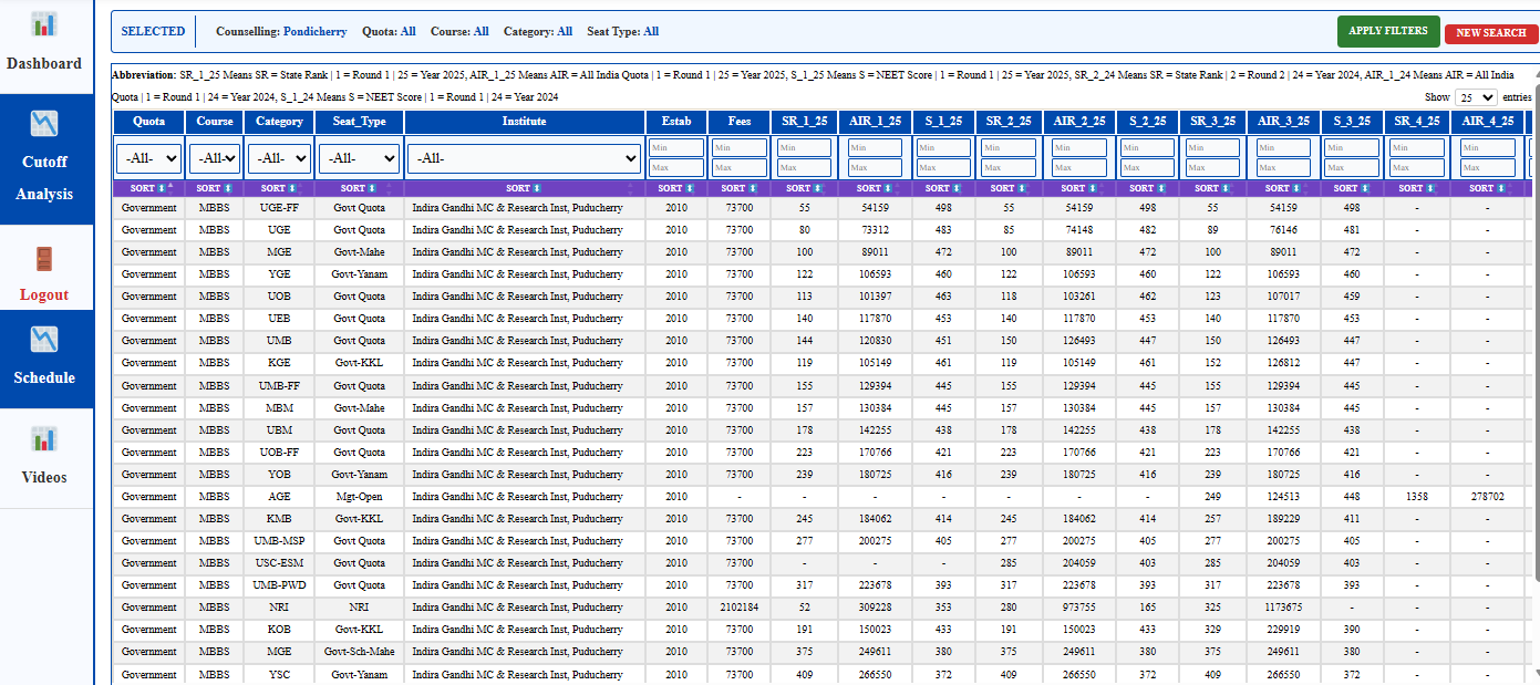 PY-Govt Quota UGE SMVMCH, Pondicherry ₹4,00L 135638(38) 140521(38) 140521(38) 147264(46) 154997(46) 155677(46)