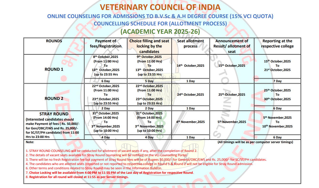 Veterinary AIQ counselling schedule 2025-2026